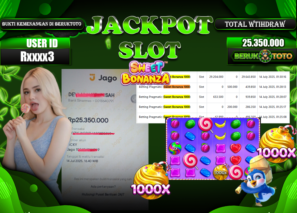 SELAMAT kepada Mr. W Telah menang dalam permainan SLOT Sweet Bonaza 1000 Rp.25,350,000,- Setelah mengisi formulir withdraw dengan hanya dalam waktu 5 - 10 Menit langsung di transfer ke rekening yang terdaftar. Bukti pembayaran ini adalah bukti yang Valid dan dapat di Pertanggung Jawabkan.