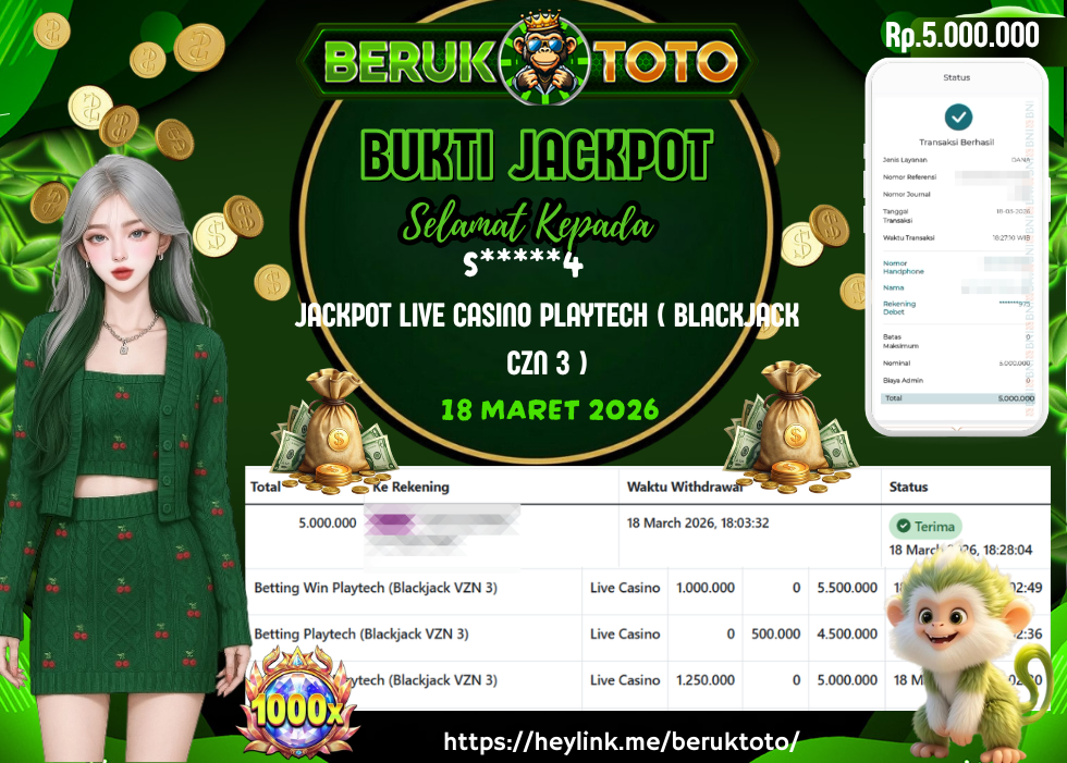 SELAMAT kepada Mr. C Telah menang dalam permainan JACKPOT LIVE CASINO PLAYTECH ( BLACKJACK VZN 3 ) Rp.5.000.000,- Setelah mengisi formulir withdraw dengan hanya dalam waktu 5 - 10 Menit langsung di transfer ke rekening yang terdaftar. Bukti pembayaran ini adalah bukti yang Valid dan dapat di Pertanggung Jawabkan.