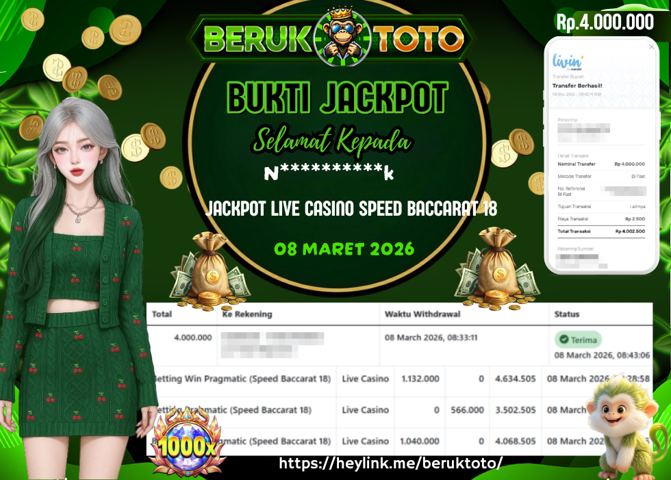 SELAMAT kepada Mr. T Telah menang dalam permainan JACKPOT LIVE CASINO SPEED BACCARAT 18 Rp.4.000.000,- Setelah mengisi formulir withdraw dengan hanya dalam waktu 5 - 10 Menit langsung di transfer ke rekening yang terdaftar. Bukti pembayaran ini adalah bukti yang Valid dan dapat di Pertanggung Jawabkan.