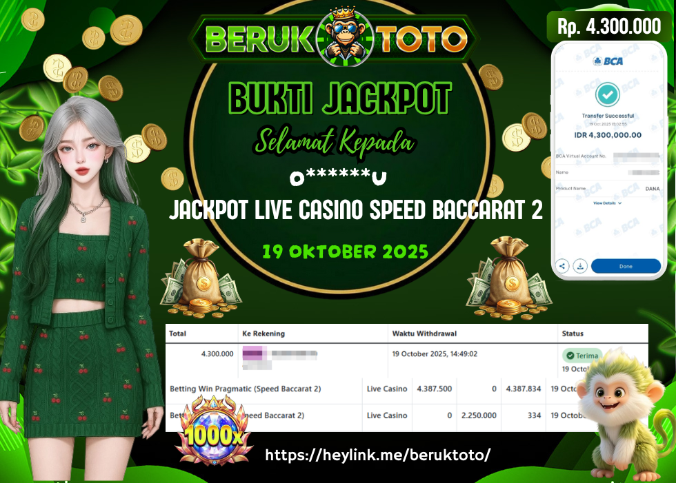 SELAMAT kepada Mr. O Telah menang dalam permainan JACKPOT LIVE CASINO SPEED BACCARAT 2 Rp.4.300.000,- Setelah mengisi formulir withdraw dengan hanya dalam waktu 5 - 10 Menit langsung di transfer ke rekening yang terdaftar. Bukti pembayaran ini adalah bukti yang Valid dan dapat di Pertanggung Jawabkan.