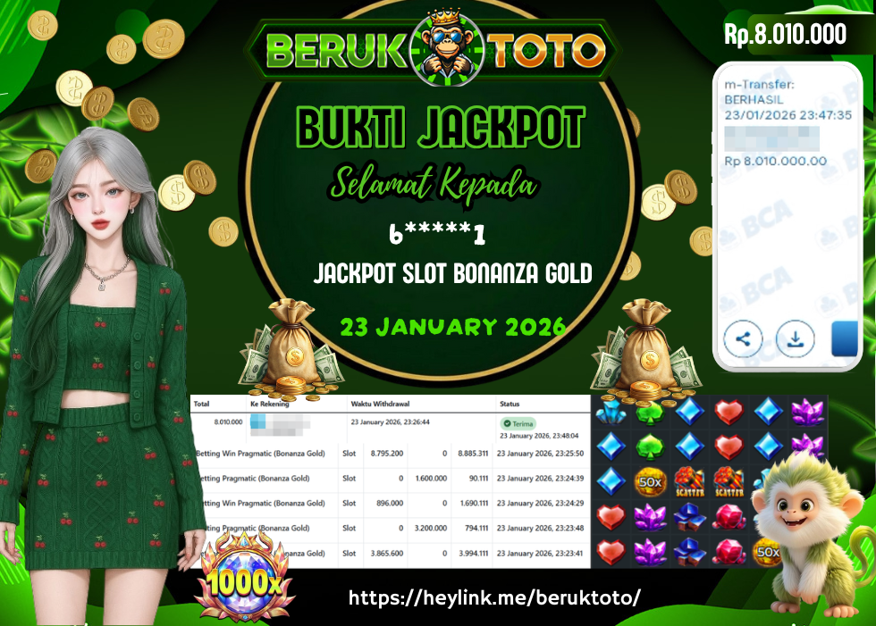 SELAMAT kepada Mr. N Telah menang dalam permainan JACKPOT SLOT BONANZA GOLD Rp.8.010.000,- Setelah mengisi formulir withdraw dengan hanya dalam waktu 5 - 10 Menit langsung di transfer ke rekening yang terdaftar. Bukti pembayaran ini adalah bukti yang Valid dan dapat di Pertanggung Jawabkan.