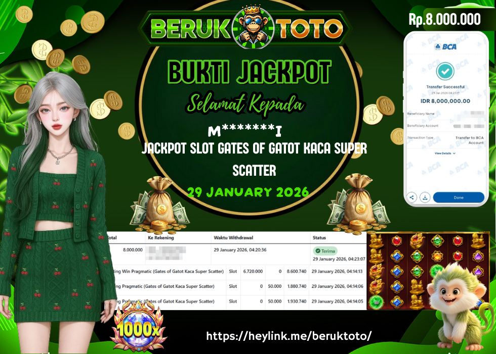 SELAMAT kepada Mr. M Telah menang dalam permainan JACKPOT SLOT GATES OF GATOT KACA SUPER SCATTER Rp.8.000.000,- Setelah mengisi formulir withdraw dengan hanya dalam waktu 5 - 10 Menit langsung di transfer ke rekening yang terdaftar. Bukti pembayaran ini adalah bukti yang Valid dan dapat di Pertanggung Jawabkan.