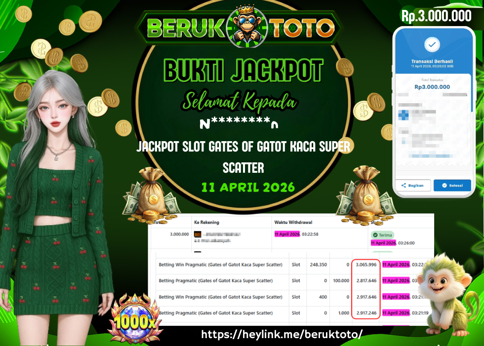 SELAMAT kepada Mr. N Telah menang dalam permainan JACKPOT SLOT GATES OF GATOT KACA SUPER SCTTER Rp.3.000.000,- Setelah mengisi formulir withdraw dengan hanya dalam waktu 5 - 10 Menit langsung di transfer ke rekening yang terdaftar. Bukti pembayaran ini adalah bukti yang Valid dan dapat di Pertanggung Jawabkan.