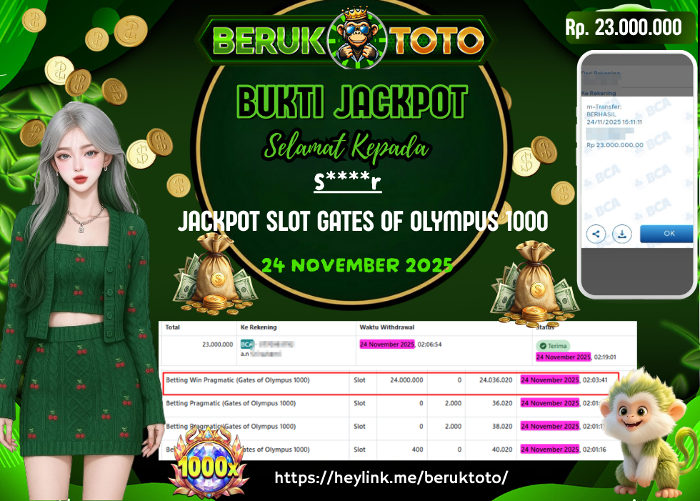 SELAMAT kepada Mr. S Telah menang dalam permainan JACKPOT SLOT GATES OF OLYMPUS 1000 Rp.23.000.000,- Setelah mengisi formulir withdraw dengan hanya dalam waktu 5 - 10 Menit langsung di transfer ke rekening yang terdaftar. Bukti pembayaran ini adalah bukti yang Valid dan dapat di Pertanggung Jawabkan.