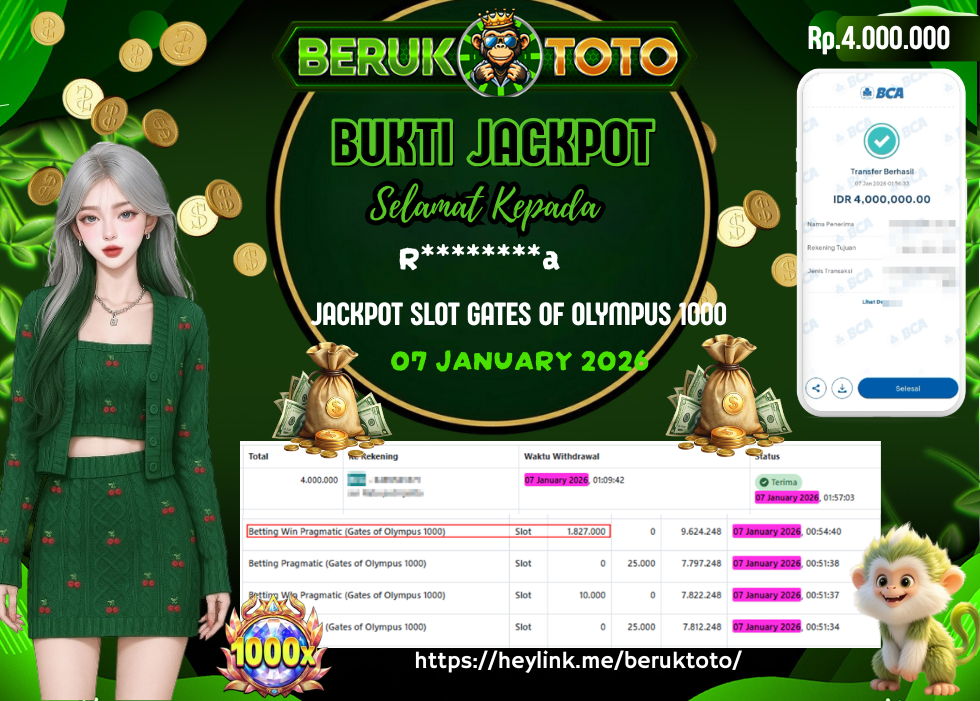 SELAMAT kepada Mr. R Telah menang dalam permainan JACKPOT SLOT GATES OF OLYMPUS 1000 Rp.4.000.000,- Setelah mengisi formulir withdraw dengan hanya dalam waktu 5 - 10 Menit langsung di transfer ke rekening yang terdaftar. Bukti pembayaran ini adalah bukti yang Valid dan dapat di Pertanggung Jawabkan.