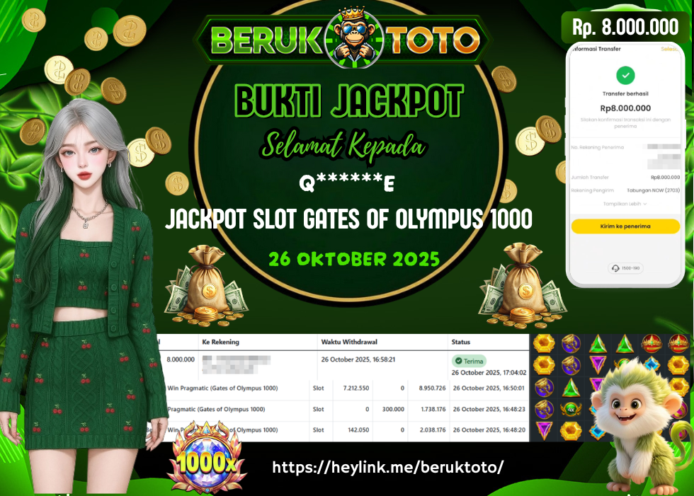 SELAMAT kepada Mr. B Telah menang dalam permainan JACKPOT SLOT GATES OF OLYMPUS 1000 Rp.8.000.000,- Setelah mengisi formulir withdraw dengan hanya dalam waktu 5 - 10 Menit langsung di transfer ke rekening yang terdaftar. Bukti pembayaran ini adalah bukti yang Valid dan dapat di Pertanggung Jawabkan.