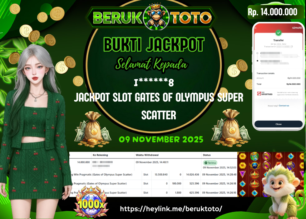 SELAMAT kepada Mr. I Telah menang dalam permainan JACKPOT SLOT GATES OF OLYMPUS SUPER SCATTER Rp.14.000.000,- Setelah mengisi formulir withdraw dengan hanya dalam waktu 5 - 10 Menit langsung di transfer ke rekening yang terdaftar. Bukti pembayaran ini adalah bukti yang Valid dan dapat di Pertanggung Jawabkan.