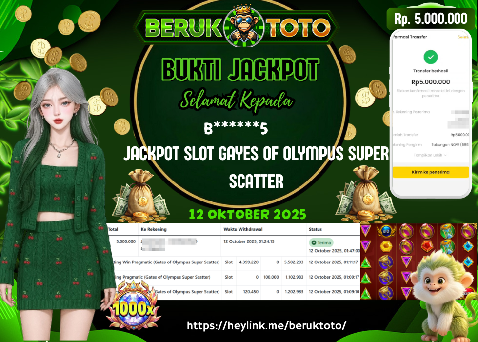 SELAMAT kepada Mr. V Telah menang dalam permainan JACKPOT SLOT GATES OF OLYMPUS SUPER SCATTER Rp.5.000.000,- Setelah mengisi formulir withdraw dengan hanya dalam waktu 5 - 10 Menit langsung di transfer ke rekening yang terdaftar. Bukti pembayaran ini adalah bukti yang Valid dan dapat di Pertanggung Jawabkan.
