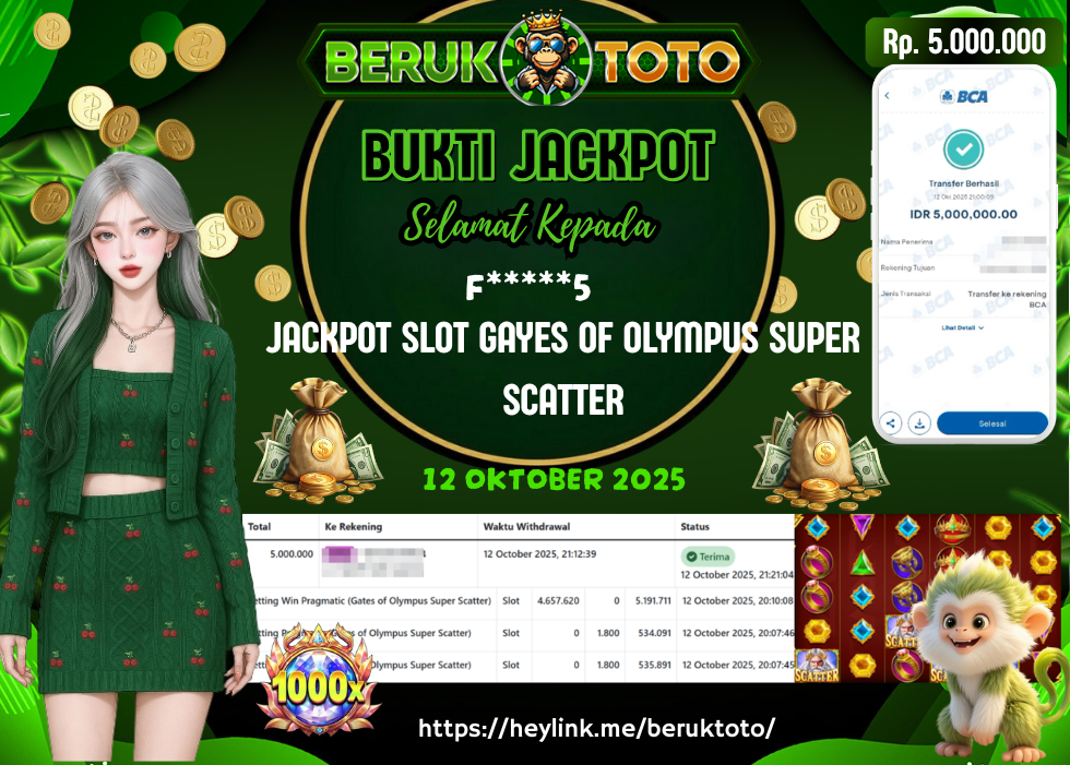 SELAMAT kepada Mr. M Telah menang dalam permainan JACKPOT SLOT GATES OF OLYMPUS SUPER SCATTER Rp.5.000.000,- Setelah mengisi formulir withdraw dengan hanya dalam waktu 5 - 10 Menit langsung di transfer ke rekening yang terdaftar. Bukti pembayaran ini adalah bukti yang Valid dan dapat di Pertanggung Jawabkan.