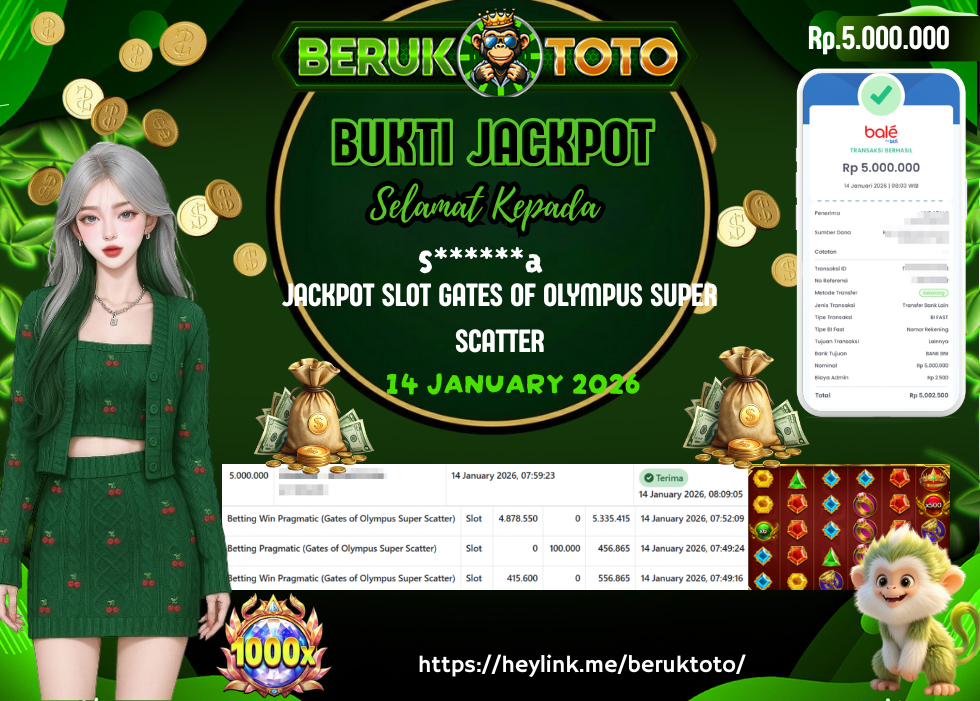 SELAMAT kepada Mr. S Telah menang dalam permainan JACKPOT SLOT GATES OF OLYMPUS SUPER SCATTER Rp.5.000.000,- Setelah mengisi formulir withdraw dengan hanya dalam waktu 5 - 10 Menit langsung di transfer ke rekening yang terdaftar. Bukti pembayaran ini adalah bukti yang Valid dan dapat di Pertanggung Jawabkan.
