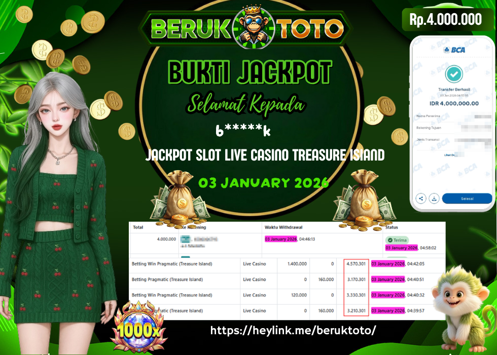 SELAMAT kepada Mr. B Telah menang dalam permainan JACKPOT SLOT LIVE CASINO TREASURE ISIAND Rp.4.000.000,- Setelah mengisi formulir withdraw dengan hanya dalam waktu 5 - 10 Menit langsung di transfer ke rekening yang terdaftar. Bukti pembayaran ini adalah bukti yang Valid dan dapat di Pertanggung Jawabkan.