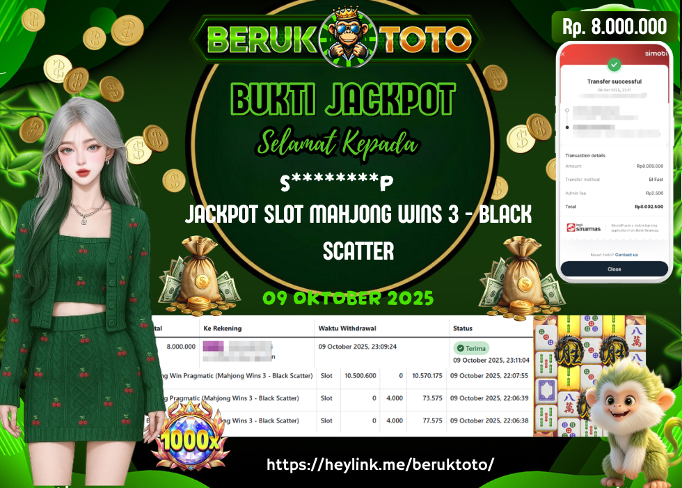 SELAMAT kepada Mr. S Telah menang dalam permainan JACKPOT SLOT MAHJONG WINS 3 - BLACK SCATTER Rp.8.000.000,- Setelah mengisi formulir withdraw dengan hanya dalam waktu 5 - 10 Menit langsung di transfer ke rekening yang terdaftar. Bukti pembayaran ini adalah bukti yang Valid dan dapat di Pertanggung Jawabkan.