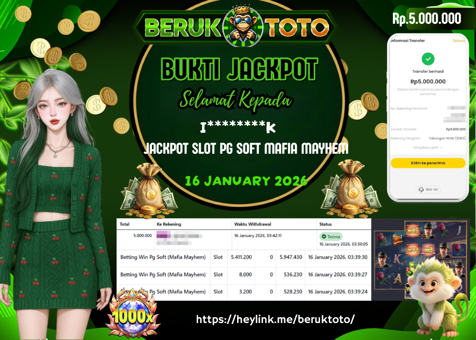 SELAMAT kepada Mr. I Telah menang dalam permainan JACKPOT SLOT PG SOFT MAFIA MAYHEM Rp.5.000.000,- Setelah mengisi formulir withdraw dengan hanya dalam waktu 5 - 10 Menit langsung di transfer ke rekening yang terdaftar. Bukti pembayaran ini adalah bukti yang Valid dan dapat di Pertanggung Jawabkan.