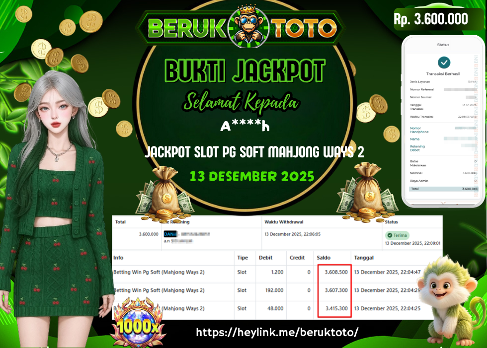 SELAMAT kepada Mr. A Telah menang dalam permainan JACKPOT SLOT PG SOFT MAHJONG WAYS 2 Rp.3.600.000,- Setelah mengisi formulir withdraw dengan hanya dalam waktu 5 - 10 Menit langsung di transfer ke rekening yang terdaftar. Bukti pembayaran ini adalah bukti yang Valid dan dapat di Pertanggung Jawabkan.