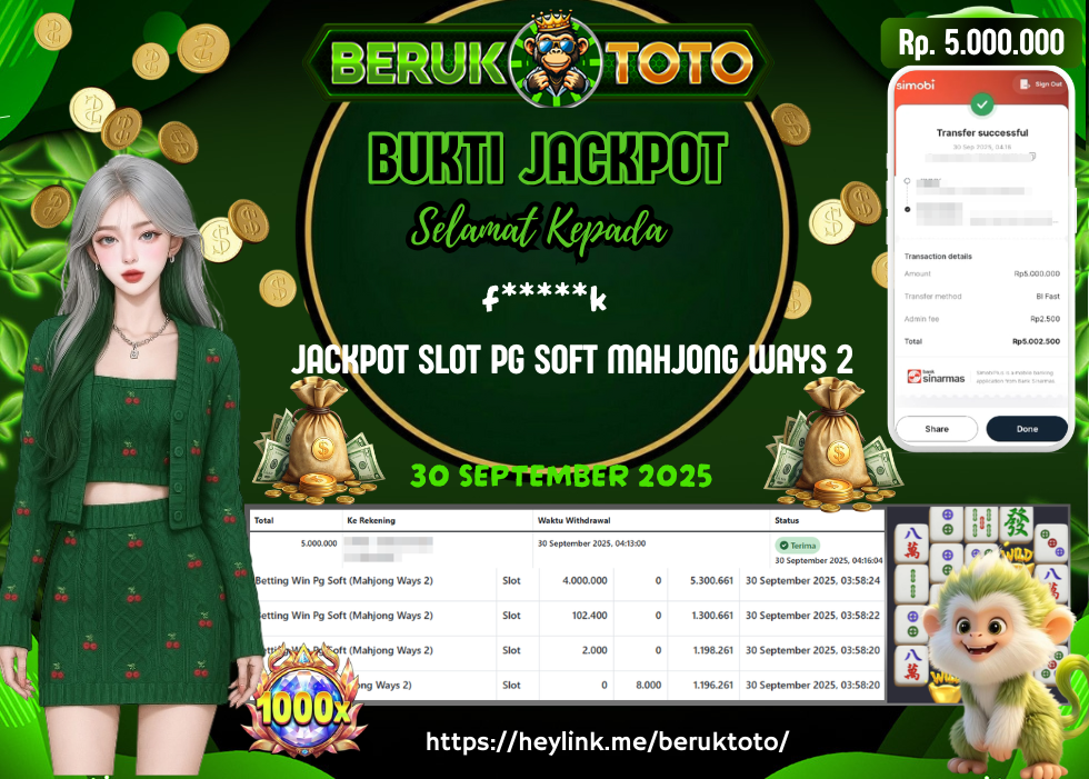 SELAMAT kepada Mr. R Telah menang dalam permainan JACKPOT SLOT PG SOFT MAHJONG WAYS 2 Rp.5.000.000,- Setelah mengisi formulir withdraw dengan hanya dalam waktu 5 - 10 Menit langsung di transfer ke rekening yang terdaftar. Bukti pembayaran ini adalah bukti yang Valid dan dapat di Pertanggung Jawabkan.