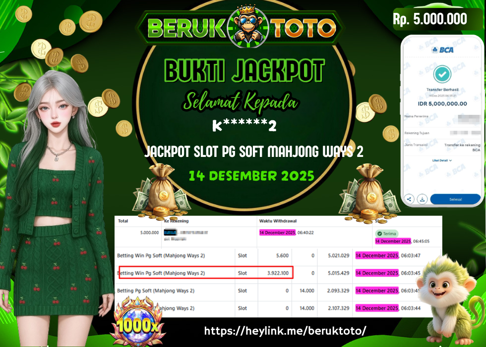 SELAMAT kepada Mr. K Telah menang dalam permainan JACKPOT SLOT PG SOFT MAHJONG WAYS 2 Rp.5.000.000,- Setelah mengisi formulir withdraw dengan hanya dalam waktu 5 - 10 Menit langsung di transfer ke rekening yang terdaftar. Bukti pembayaran ini adalah bukti yang Valid dan dapat di Pertanggung Jawabkan.