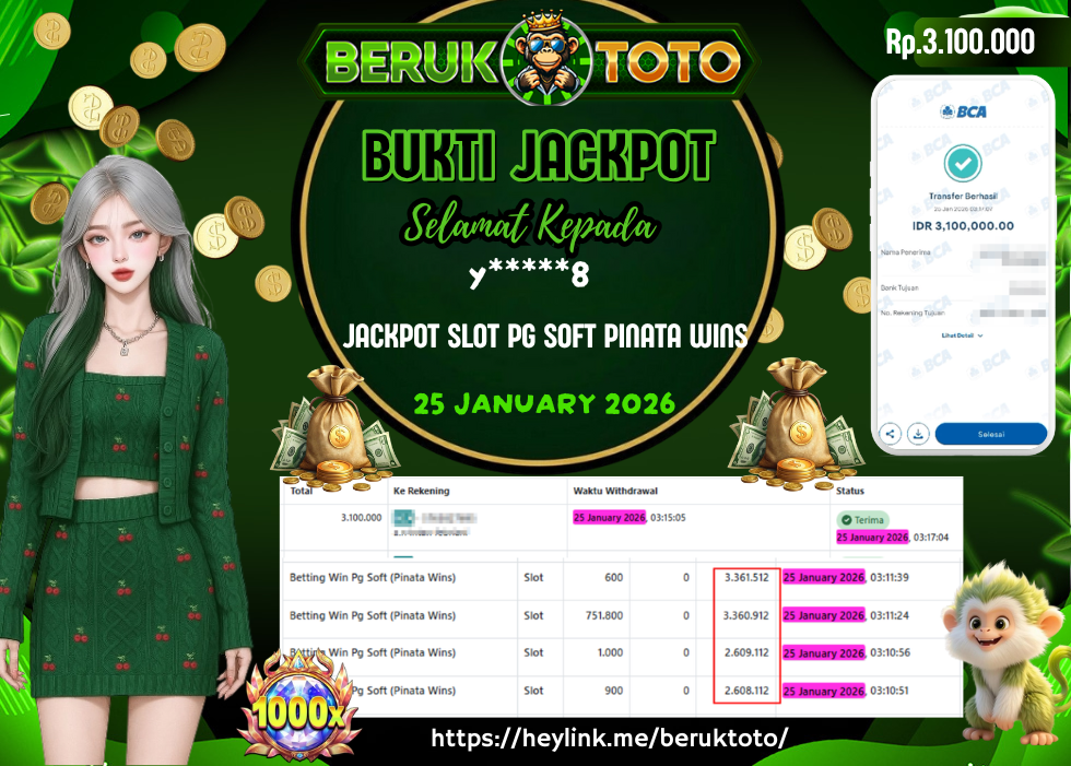 SELAMAT kepada Mr. Y Telah menang dalam permainan JACKPOT SLOT PG SOFT PINATA WINS Rp.3.100.000,- Setelah mengisi formulir withdraw dengan hanya dalam waktu 5 - 10 Menit langsung di transfer ke rekening yang terdaftar. Bukti pembayaran ini adalah bukti yang Valid dan dapat di Pertanggung Jawabkan.