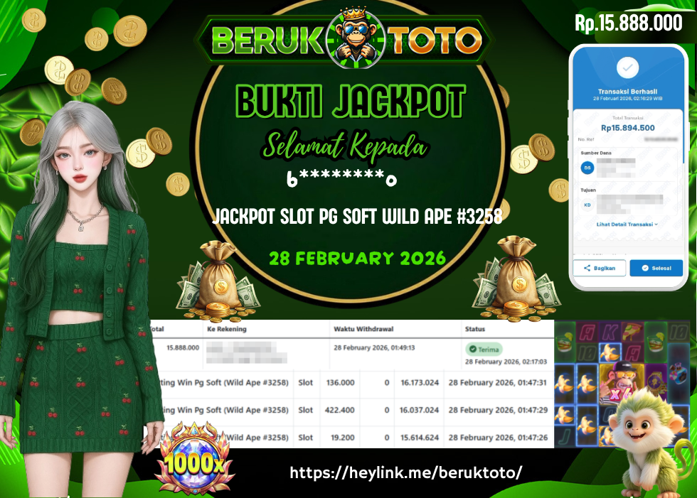 SELAMAT kepada Mr. K Telah menang dalam permainan JACKPOT SLOT PG SOFT SOFT WILD APE #3258 Rp.15.888.000,- Setelah mengisi formulir withdraw dengan hanya dalam waktu 5 - 10 Menit langsung di transfer ke rekening yang terdaftar. Bukti pembayaran ini adalah bukti yang Valid dan dapat di Pertanggung Jawabkan.