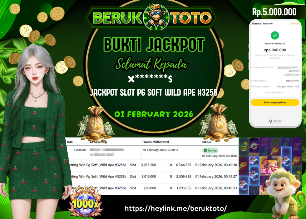 SELAMAT kepada Mr. S Telah menang dalam permainan JACKPOT SLOT PG SOFT WILD APE #3258 Rp.5.000.000,- Setelah mengisi formulir withdraw dengan hanya dalam waktu 5 - 10 Menit langsung di transfer ke rekening yang terdaftar. Bukti pembayaran ini adalah bukti yang Valid dan dapat di Pertanggung Jawabkan.