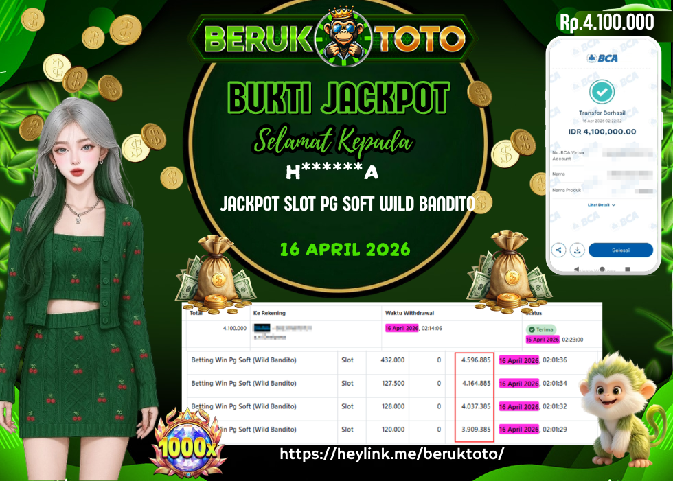 SELAMAT kepada Mr. H Telah menang dalam permainan JACKPOT SLOT PG SOFT WILD BANDITO Rp.4.100.000,- Setelah mengisi formulir withdraw dengan hanya dalam waktu 5 - 10 Menit langsung di transfer ke rekening yang terdaftar. Bukti pembayaran ini adalah bukti yang Valid dan dapat di Pertanggung Jawabkan.