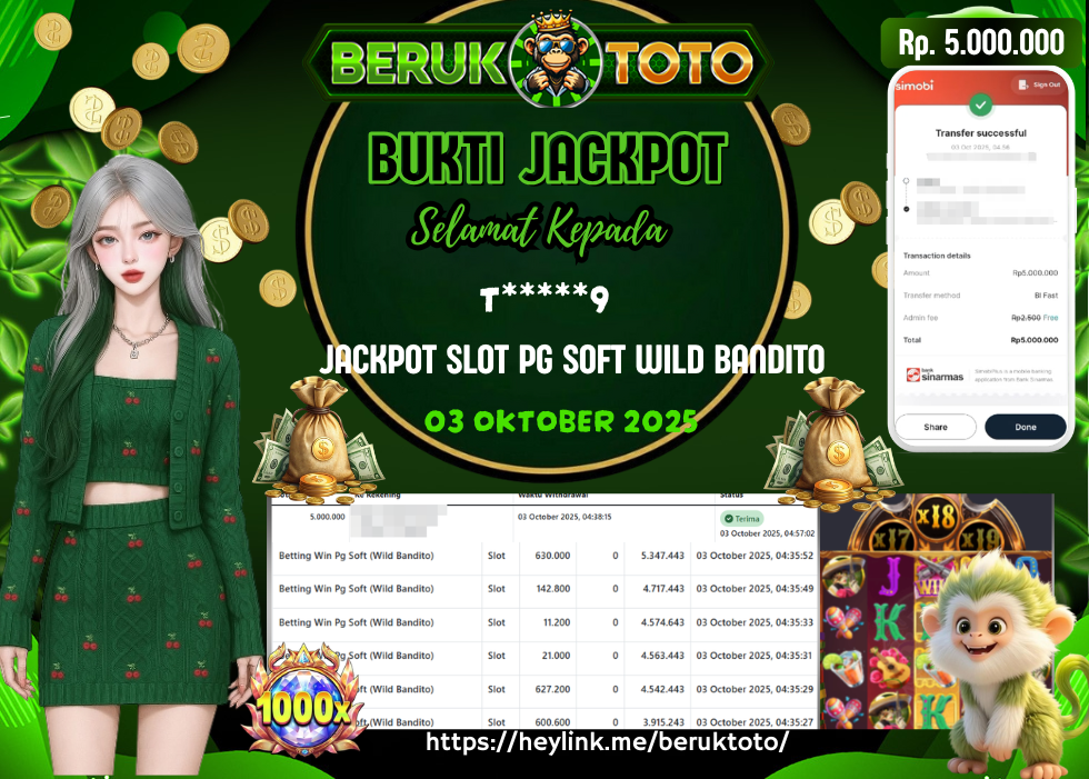 SELAMAT kepada Mr. T Telah menang dalam permainan JACKPOT SLOT SPG SOFT WILD BANDITO Rp.5.000.000,- Setelah mengisi formulir withdraw dengan hanya dalam waktu 5 - 10 Menit langsung di transfer ke rekening yang terdaftar. Bukti pembayaran ini adalah bukti yang Valid dan dapat di Pertanggung Jawabkan.
