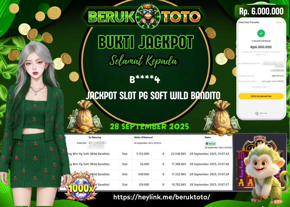 SELAMAT kepada Mr. A Telah menang dalam permainan JACKPOT SLOT PG SOFT WILD BANDITO Rp.6.000.000,- Setelah mengisi formulir withdraw dengan hanya dalam waktu 5 - 10 Menit langsung di transfer ke rekening yang terdaftar. Bukti pembayaran ini adalah bukti yang Valid dan dapat di Pertanggung Jawabkan.