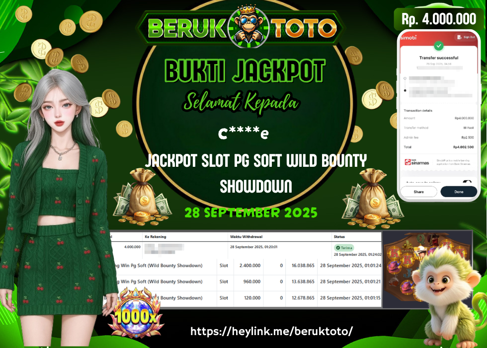 SELAMAT kepada Mr. D Telah menang dalam permainan JACKPOT SLOT PG SOFT WILD BOUNTY SHOWDOWN Rp.4.000.000,- Setelah mengisi formulir withdraw dengan hanya dalam waktu 5 - 10 Menit langsung di transfer ke rekening yang terdaftar. Bukti pembayaran ini adalah bukti yang Valid dan dapat di Pertanggung Jawabkan.