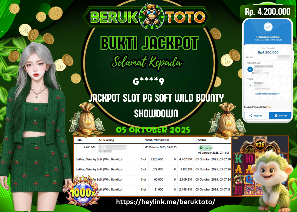 SELAMAT kepada Mr. W Telah menang dalam permainan JACKPOT SLOT PG SOFT WILD BOUNTY SHOWDOWN Rp.4.200.000,- Setelah mengisi formulir withdraw dengan hanya dalam waktu 5 - 10 Menit langsung di transfer ke rekening yang terdaftar. Bukti pembayaran ini adalah bukti yang Valid dan dapat di Pertanggung Jawabkan.