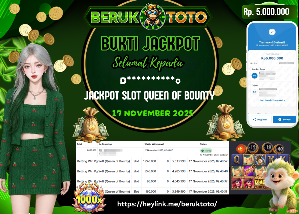 SELAMAT kepada Mr. D Telah menang dalam permainan JACKPOT SLOT QUEEN OF BOUNTY Rp.5.000.000,- Setelah mengisi formulir withdraw dengan hanya dalam waktu 5 - 10 Menit langsung di transfer ke rekening yang terdaftar. Bukti pembayaran ini adalah bukti yang Valid dan dapat di Pertanggung Jawabkan.