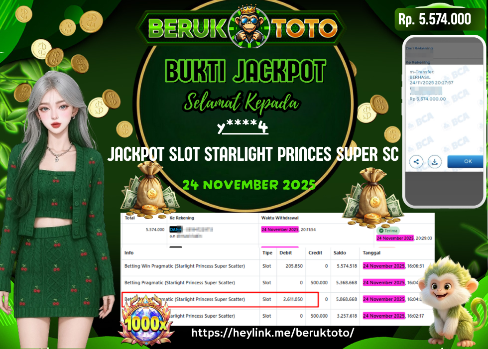 SELAMAT kepada Mr. y Telah menang dalam permainan JACKPOT SLOT PG STARLIGHT PRINCES SUPER SCATTER Rp.5.574.000,- Setelah mengisi formulir withdraw dengan hanya dalam waktu 5 - 10 Menit langsung di transfer ke rekening yang terdaftar. Bukti pembayaran ini adalah bukti yang Valid dan dapat di Pertanggung Jawabkan.