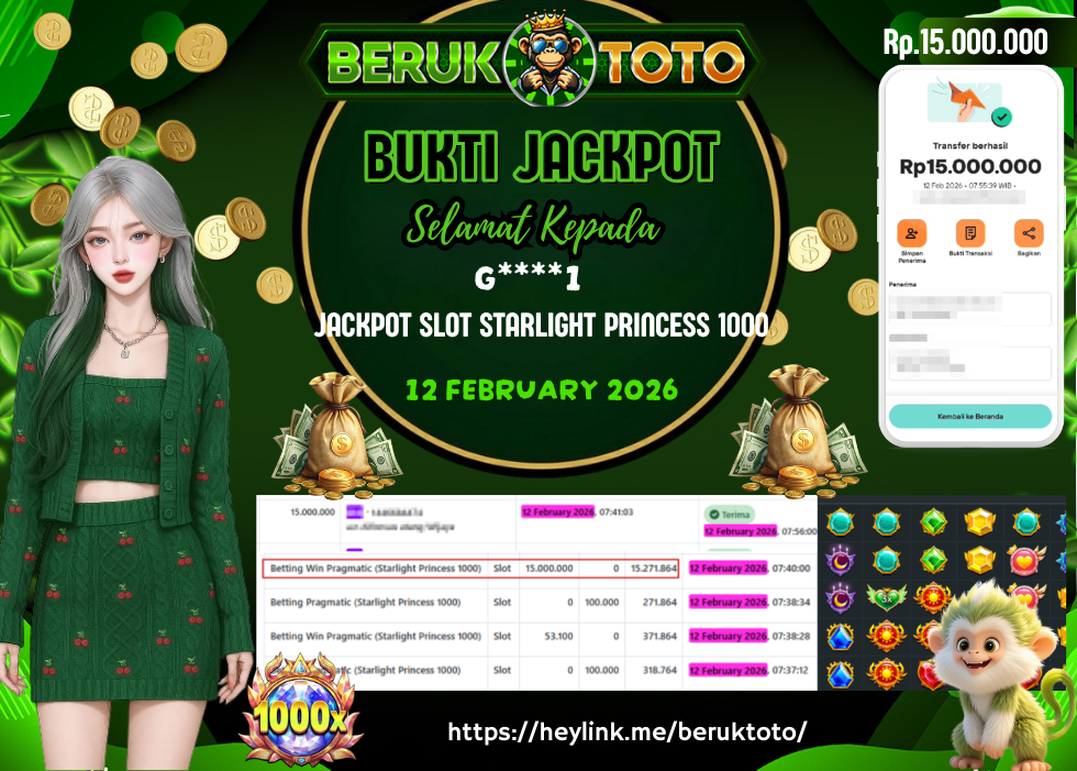 SELAMAT kepada Mr. G Telah menang dalam permainan JACKPOT SLOT STARLIGHT PRINCESS 1000 Rp.15.000.000,- Setelah mengisi formulir withdraw dengan hanya dalam waktu 5 - 10 Menit langsung di transfer ke rekening yang terdaftar. Bukti pembayaran ini adalah bukti yang Valid dan dapat di Pertanggung Jawabkan.