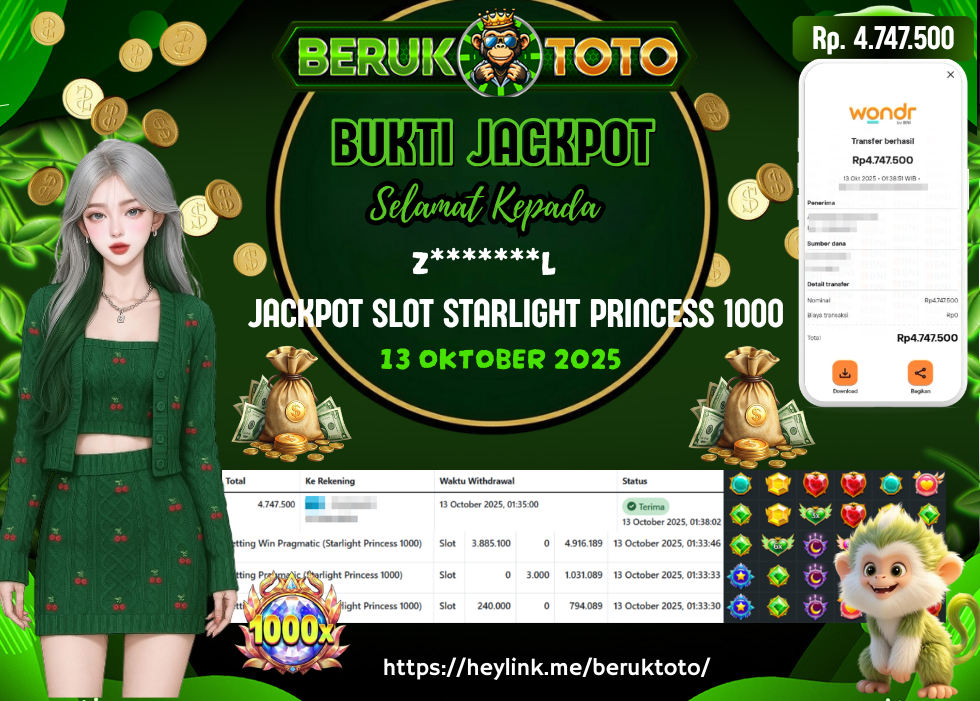 SELAMAT kepada Mr. Y Telah menang dalam permainan JACKPOT SLOT STARLIGHT PRINCESS 1000 Rp.4.747.500,- Setelah mengisi formulir withdraw dengan hanya dalam waktu 5 - 10 Menit langsung di transfer ke rekening yang terdaftar. Bukti pembayaran ini adalah bukti yang Valid dan dapat di Pertanggung Jawabkan.