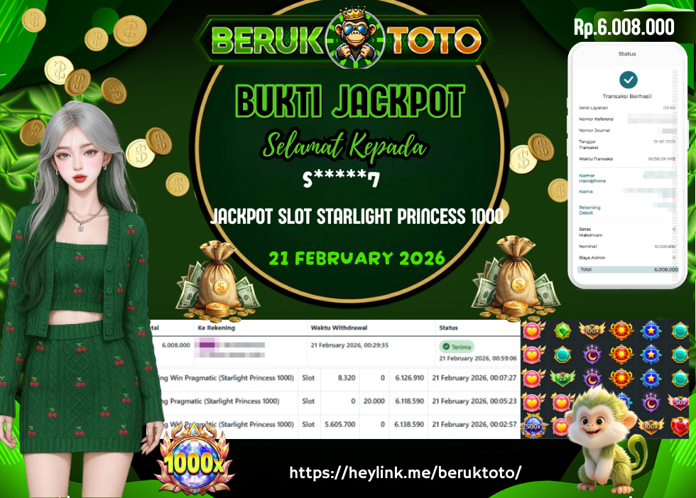 SELAMAT kepada Mr. A Telah menang dalam permainan JACKPOT STARLIGHT PRINCESS 1000 Rp.6.008.000,- Setelah mengisi formulir withdraw dengan hanya dalam waktu 5 - 10 Menit langsung di transfer ke rekening yang terdaftar. Bukti pembayaran ini adalah bukti yang Valid dan dapat di Pertanggung Jawabkan.