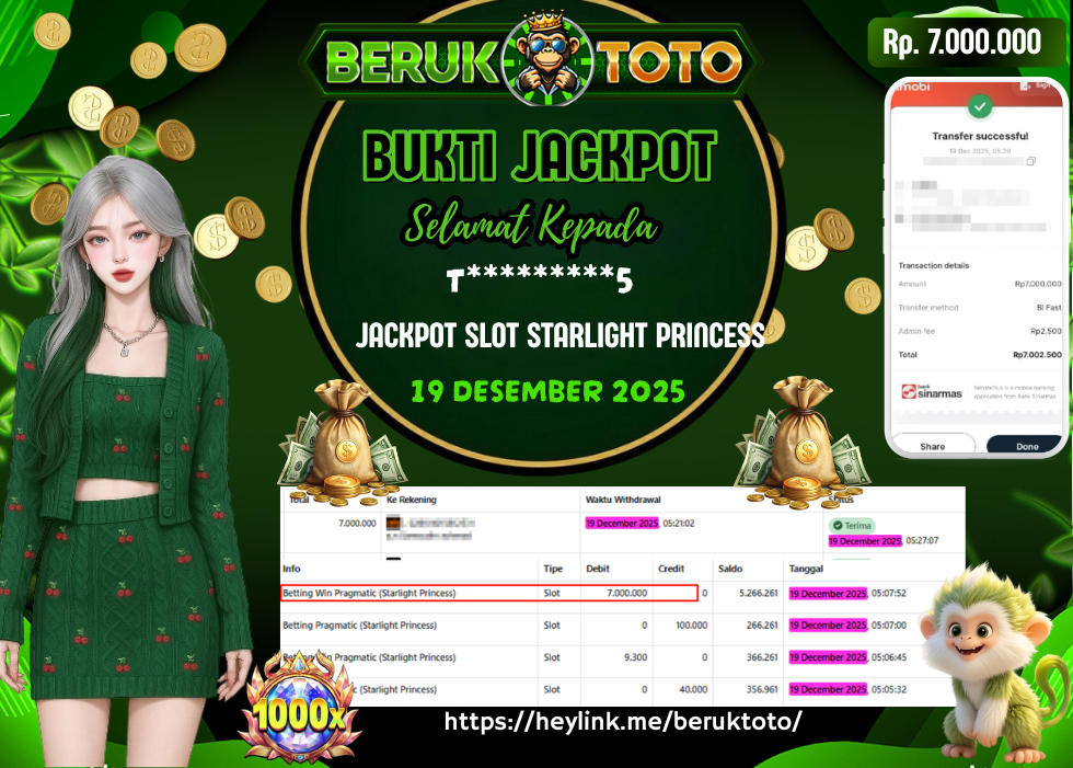 SELAMAT kepada Mr. T Telah menang dalam permainan JACKPOT SLOT STARLIGHT PRINCESS Rp.7.000.000,- Setelah mengisi formulir withdraw dengan hanya dalam waktu 5 - 10 Menit langsung di transfer ke rekening yang terdaftar. Bukti pembayaran ini adalah bukti yang Valid dan dapat di Pertanggung Jawabkan.