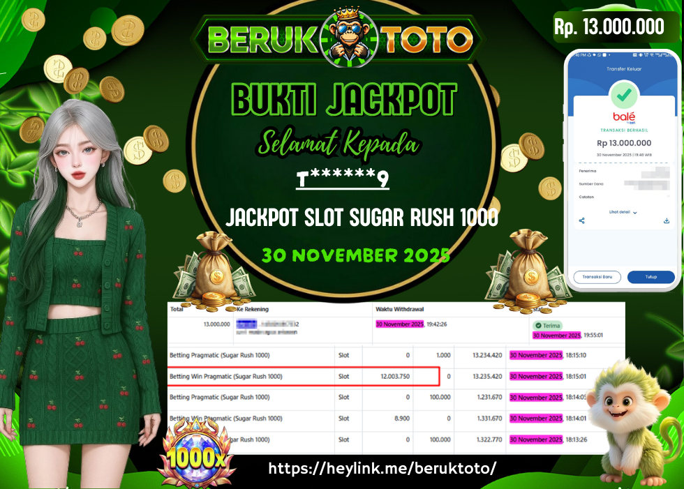 SELAMAT kepada Mr. T Telah menang dalam permainan JACKPOT SLOT SUGAR RUSH 1000 Rp.13.000.000,- Setelah mengisi formulir withdraw dengan hanya dalam waktu 5 - 10 Menit langsung di transfer ke rekening yang terdaftar. Bukti pembayaran ini adalah bukti yang Valid dan dapat di Pertanggung Jawabkan.