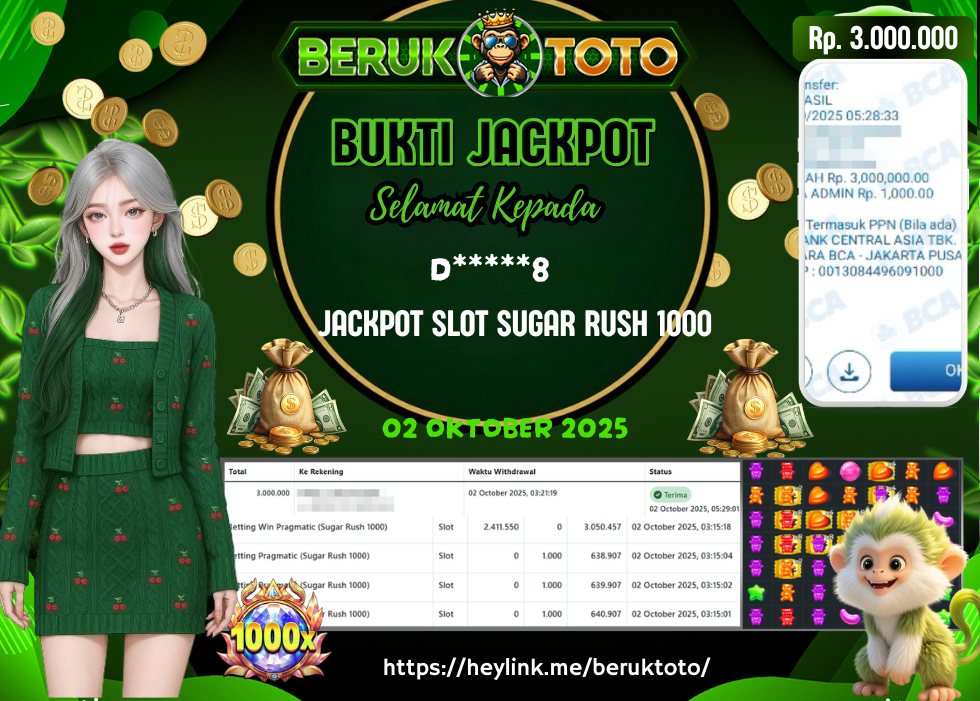 SELAMAT kepada Mr. A Telah menang dalam permainan JACKPOT SLOT SUGAR RUSH 1000 Rp.3.000.000,- Setelah mengisi formulir withdraw dengan hanya dalam waktu 5 - 10 Menit langsung di transfer ke rekening yang terdaftar. Bukti pembayaran ini adalah bukti yang Valid dan dapat di Pertanggung Jawabkan.