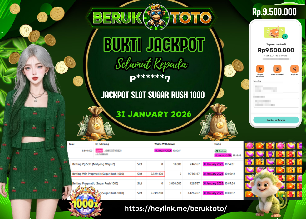 SELAMAT kepada Mr. P Telah menang dalam permainan JACKPOT SLOT SUGAR RUSH 1000 Rp.9.500.000,- Setelah mengisi formulir withdraw dengan hanya dalam waktu 5 - 10 Menit langsung di transfer ke rekening yang terdaftar. Bukti pembayaran ini adalah bukti yang Valid dan dapat di Pertanggung Jawabkan.