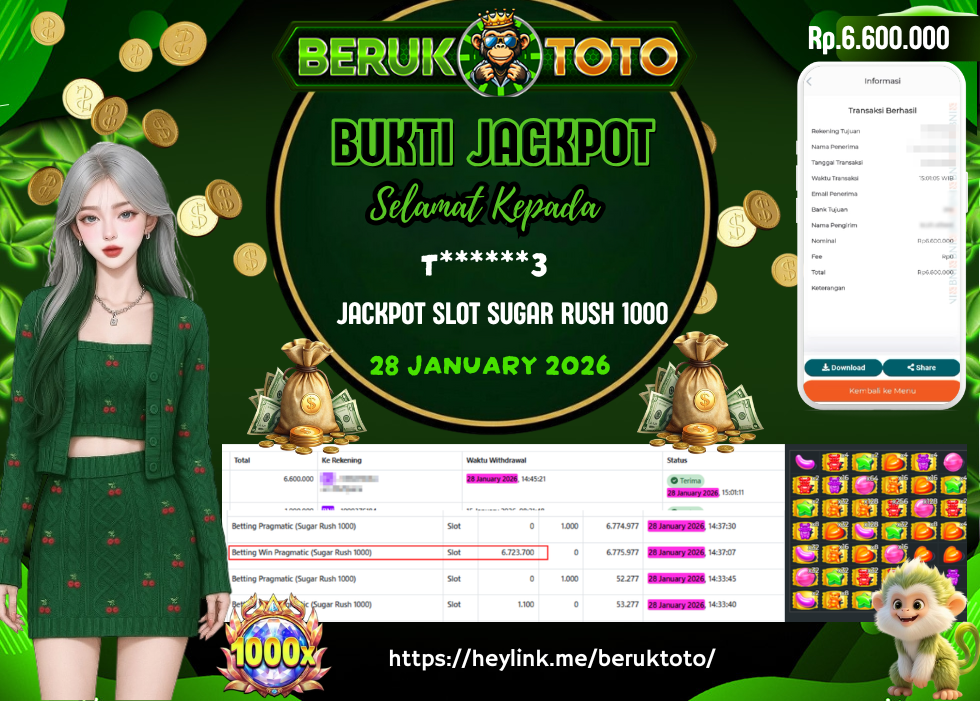 SELAMAT kepada Mr. T Telah menang dalam permainan JACKPOT SLOT SUGAR RUST 1000 Rp.6.600.000,- Setelah mengisi formulir withdraw dengan hanya dalam waktu 5 - 10 Menit langsung di transfer ke rekening yang terdaftar. Bukti pembayaran ini adalah bukti yang Valid dan dapat di Pertanggung Jawabkan.