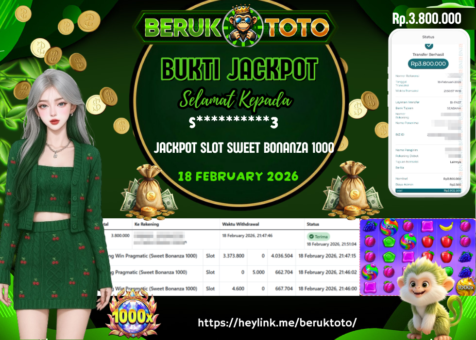 SELAMAT kepada Mr. S Telah menang dalam permainan JACKPOT SLOT SWEET BONANAZA 1000 Rp.3.800.000,- Setelah mengisi formulir withdraw dengan hanya dalam waktu 5 - 10 Menit langsung di transfer ke rekening yang terdaftar. Bukti pembayaran ini adalah bukti yang Valid dan dapat di Pertanggung Jawabkan.