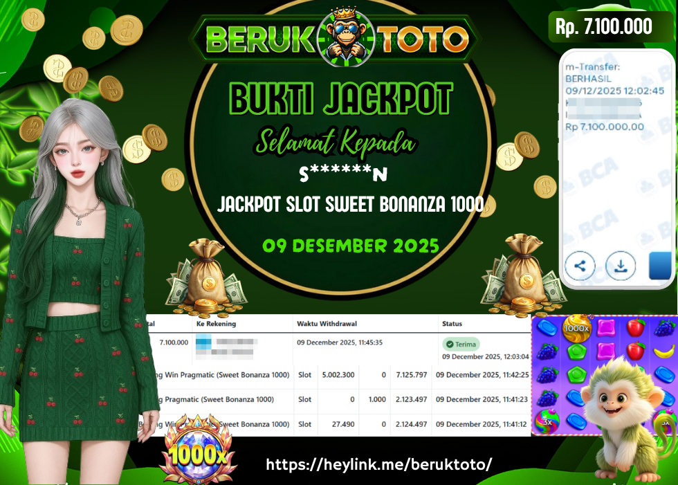 SELAMAT kepada Mr. I Telah menang dalam permainan JACKPOT SLOT SWEET BONANZA 1000 Rp.7.100.000,- Setelah mengisi formulir withdraw dengan hanya dalam waktu 5 - 10 Menit langsung di transfer ke rekening yang terdaftar. Bukti pembayaran ini adalah bukti yang Valid dan dapat di Pertanggung Jawabkan.