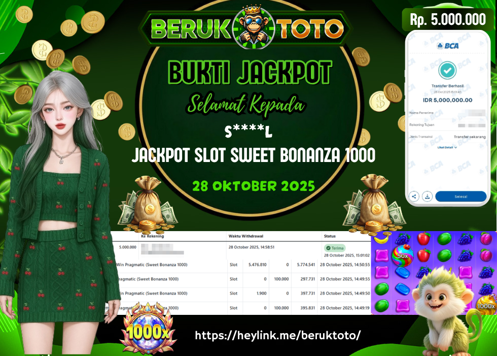 SELAMAT kepada Mr. B Telah menang dalam permainan JACKPOT SLOT SWEET BONANZA 1000 Rp.5.000.000,- Setelah mengisi formulir withdraw dengan hanya dalam waktu 5 - 10 Menit langsung di transfer ke rekening yang terdaftar. Bukti pembayaran ini adalah bukti yang Valid dan dapat di Pertanggung Jawabkan.