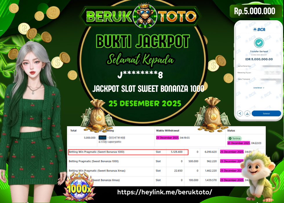 SELAMAT kepada Mr. J Telah menang dalam permainan JACKPOT SLOT SWEET BONANZA 1000 Rp.5.000.000,- Setelah mengisi formulir withdraw dengan hanya dalam waktu 5 - 10 Menit langsung di transfer ke rekening yang terdaftar. Bukti pembayaran ini adalah bukti yang Valid dan dapat di Pertanggung Jawabkan.