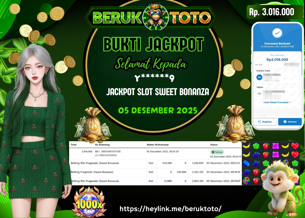 SELAMAT kepada Mr. Y Telah menang dalam permainan JACKPOT SLOT SWEET BONANZA Rp.3.016.000,- Setelah mengisi formulir withdraw dengan hanya dalam waktu 5 - 10 Menit langsung di transfer ke rekening yang terdaftar. Bukti pembayaran ini adalah bukti yang Valid dan dapat di Pertanggung Jawabkan.