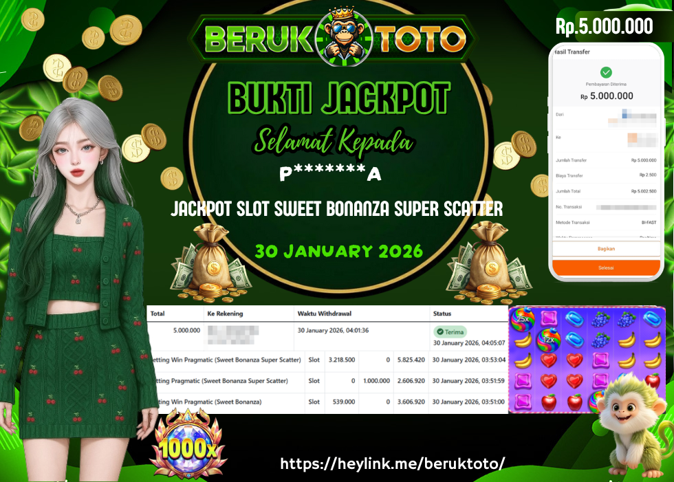 SELAMAT kepada Mr. P.A Telah menang dalam permainan JACKPOT SLOT SWEET BONANZA SUPER SCATTER Rp.5.000.000,- Setelah mengisi formulir withdraw dengan hanya dalam waktu 5 - 10 Menit langsung di transfer ke rekening yang terdaftar. Bukti pembayaran ini adalah bukti yang Valid dan dapat di Pertanggung Jawabkan.