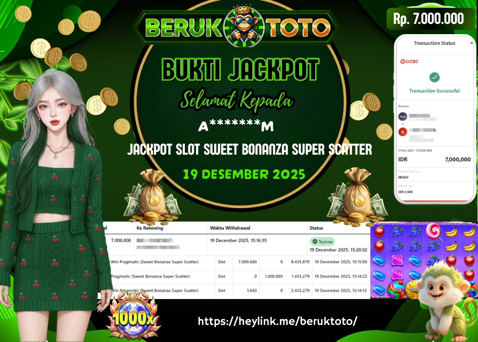 SELAMAT kepada Mr. A Telah menang dalam permainan JACKPOT SLOT SWEET BONANZA SUPER SCATTER Rp.7.000.000,- Setelah mengisi formulir withdraw dengan hanya dalam waktu 5 - 10 Menit langsung di transfer ke rekening yang terdaftar. Bukti pembayaran ini adalah bukti yang Valid dan dapat di Pertanggung Jawabkan.