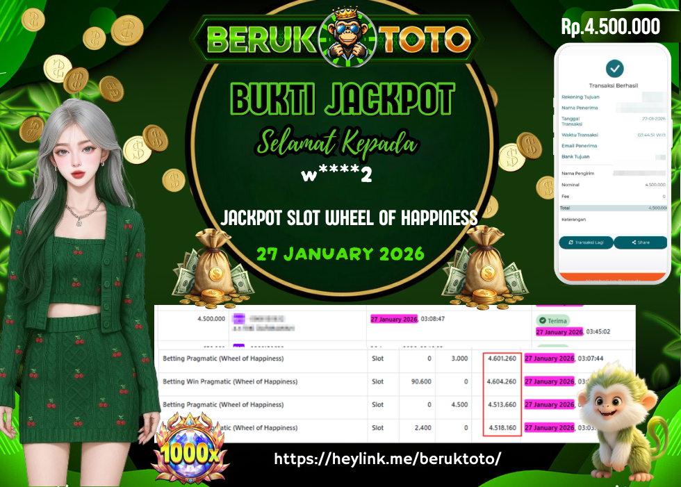 SELAMAT kepada Mr. w Telah menang dalam permainan JACKPOT SLOT WHEEL OF HAPPINESS Rp.4.500.000,- Setelah mengisi formulir withdraw dengan hanya dalam waktu 5 - 10 Menit langsung di transfer ke rekening yang terdaftar. Bukti pembayaran ini adalah bukti yang Valid dan dapat di Pertanggung Jawabkan.
