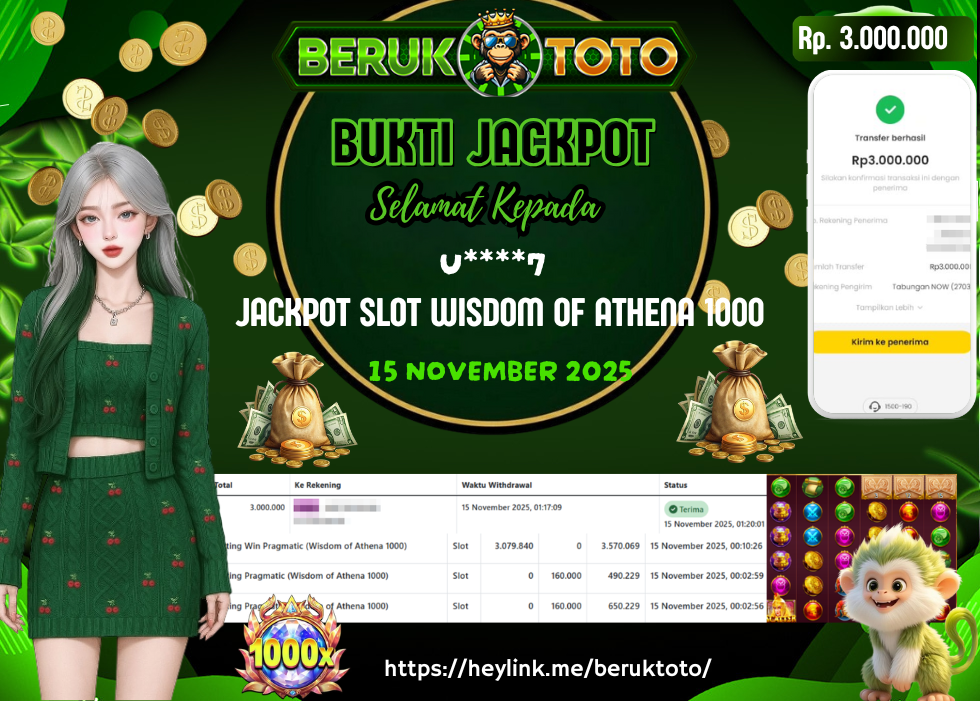 SELAMAT kepada Mr. U Telah menang dalam permainan JACKPOT SLOT WISDOM OF ATHENA 1000 Rp.3.000.000,- Setelah mengisi formulir withdraw dengan hanya dalam waktu 5 - 10 Menit langsung di transfer ke rekening yang terdaftar. Bukti pembayaran ini adalah bukti yang Valid dan dapat di Pertanggung Jawabkan.