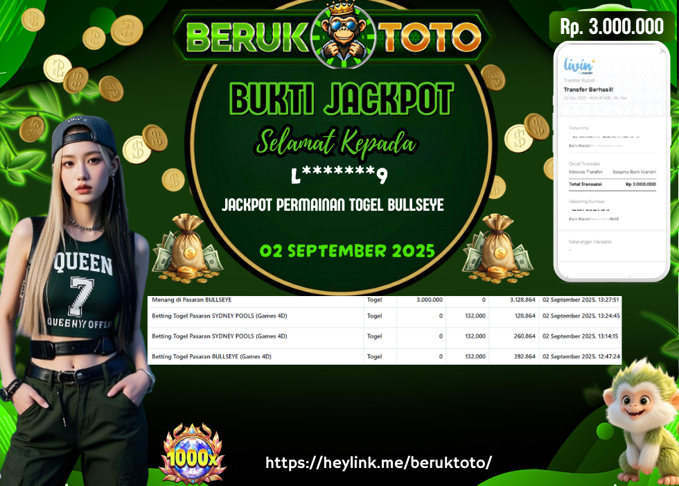 SELAMAT kepada Mr. L Telah menang dalam permainan TOGEL BULLSEYE Rp 3.000.000,- Setelah mengisi formulir withdraw dengan hanya dalam waktu 5 - 10 Menit langsung di transfer ke rekening yang terdaftar. Bukti pembayaran ini adalah bukti yang Valid dan dapat di Pertanggung Jawabkan.