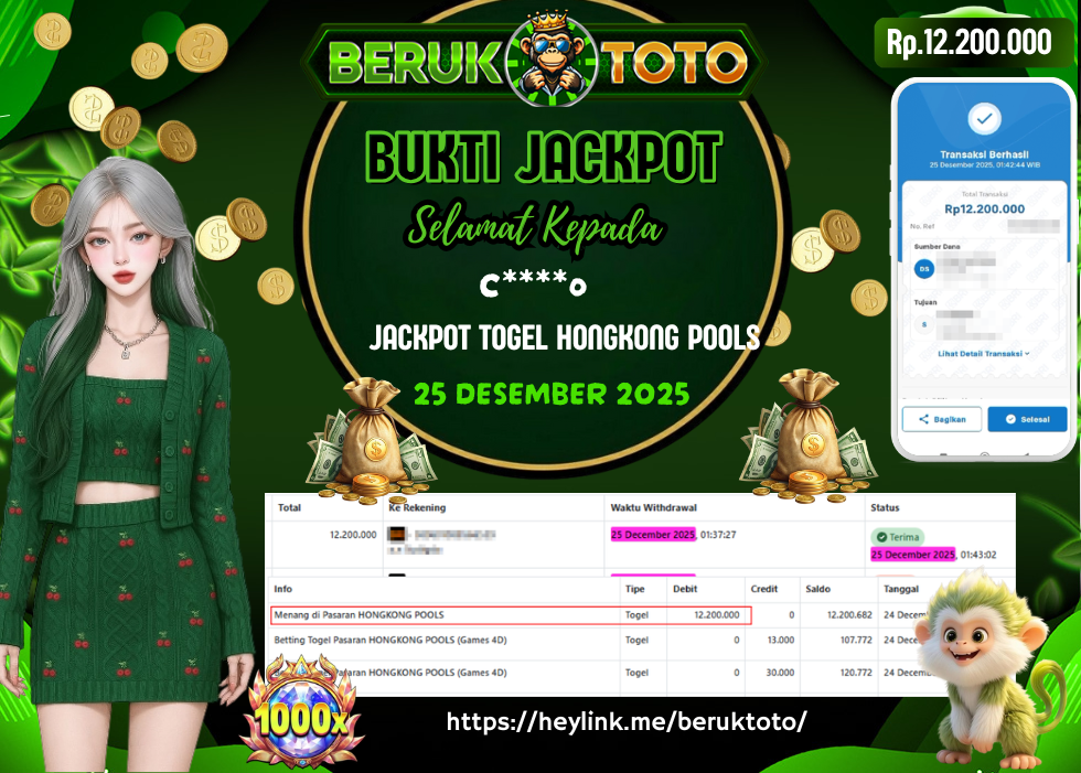 SELAMAT kepada Mr. C Telah menang dalam permainan JACKPOT TOGEL HONGKONG POOLS Rp.12.200.000,-Setelah mengisi formulir withdraw dengan hanya dalam waktu 5 - 10 Menit langsung di transfer ke rekening yang terdaftar. Bukti pembayaran ini adalah bukti yang Valid dan dapat di Pertanggung Jawabkan.