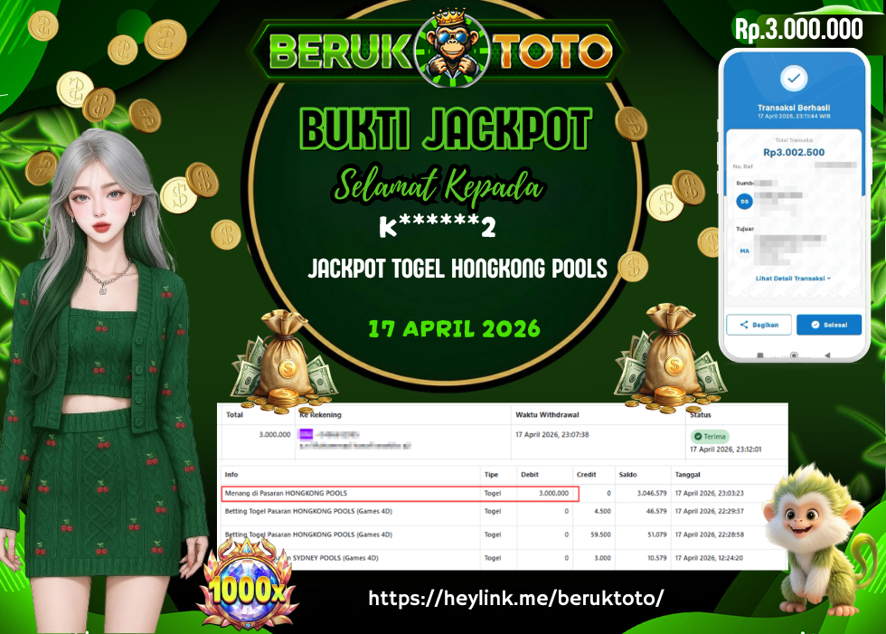 SELAMAT kepada Mr. K Telah menang dalam permainan JACKPOT TOGEL HONGKONG POOLS Rp.3.000.000,- Setelah mengisi formulir withdraw dengan hanya dalam waktu 5 - 10 Menit langsung di transfer ke rekening yang terdaftar. Bukti pembayaran ini adalah bukti yang Valid dan dapat di Pertanggung Jawabkan.